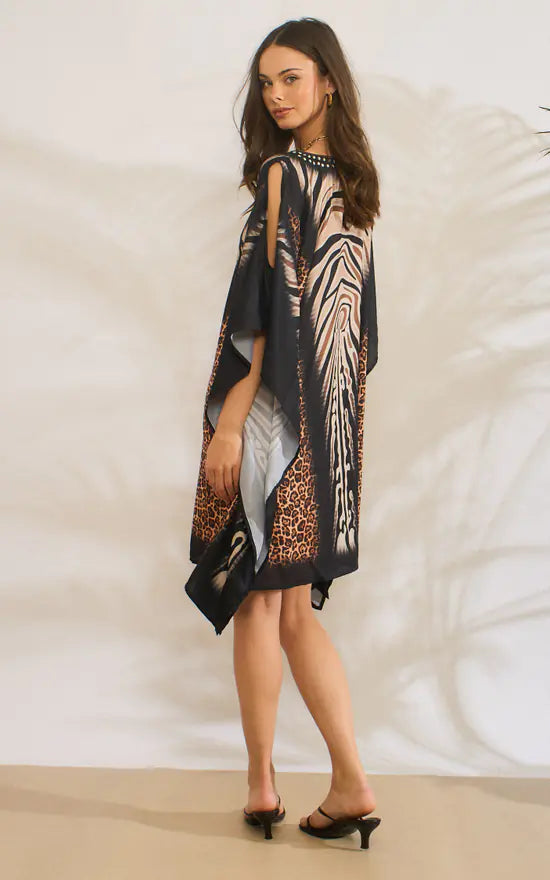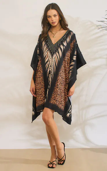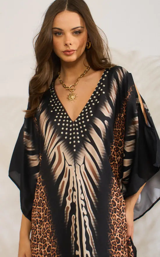 A colourful floaty kaftan for your beachwear or summer daywear, for a boho effortless look. This summer staple is perfect if you are heading out for cocktails on the beach. Pair with strappy sandals to complete your look.